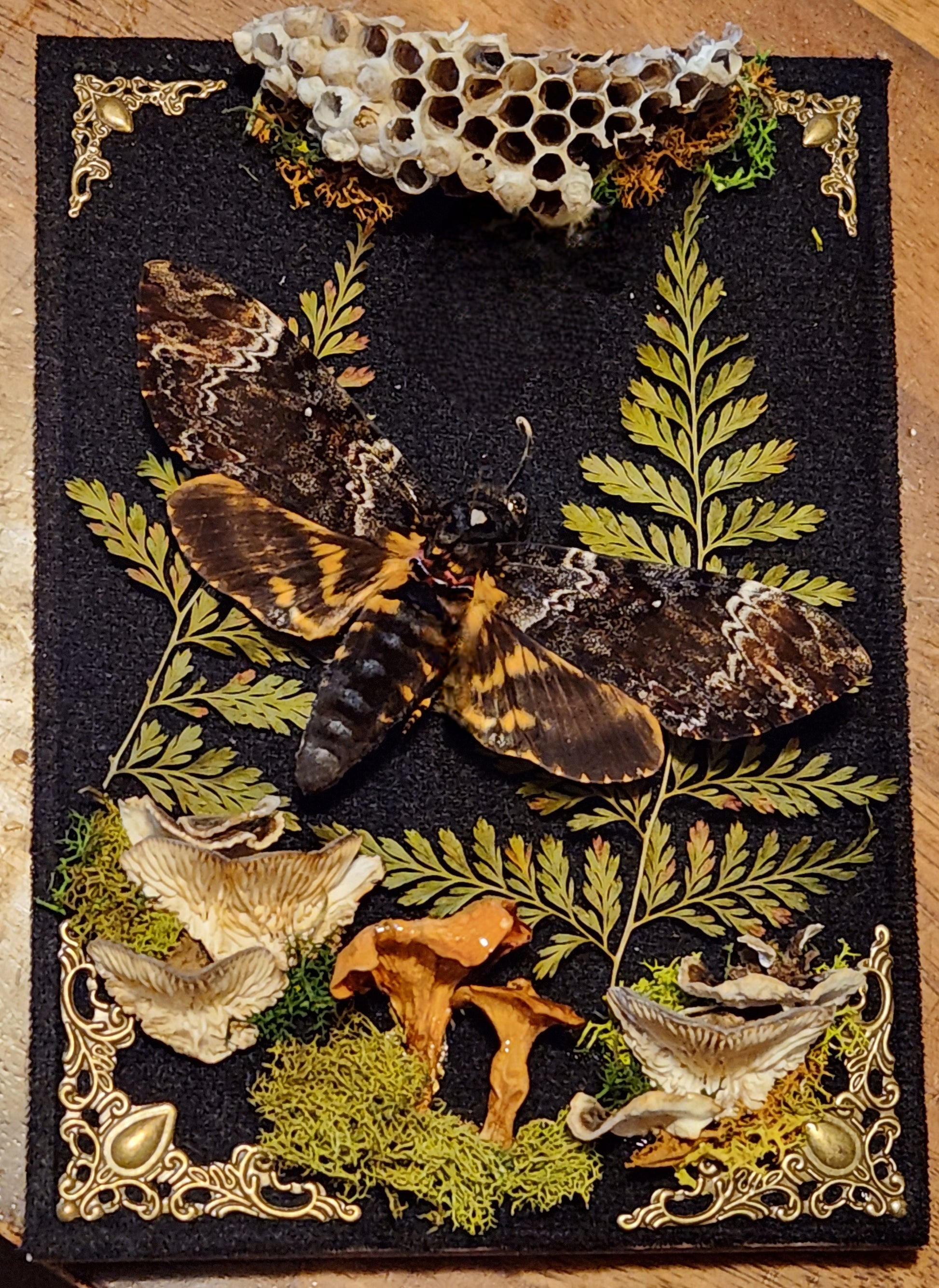 Featuring deathhead hawkmoth, paperwasp nest, turkey tail mushrooms, chanterelle mushrooms, preserved moss, rabbitfoot ferns, corner details.