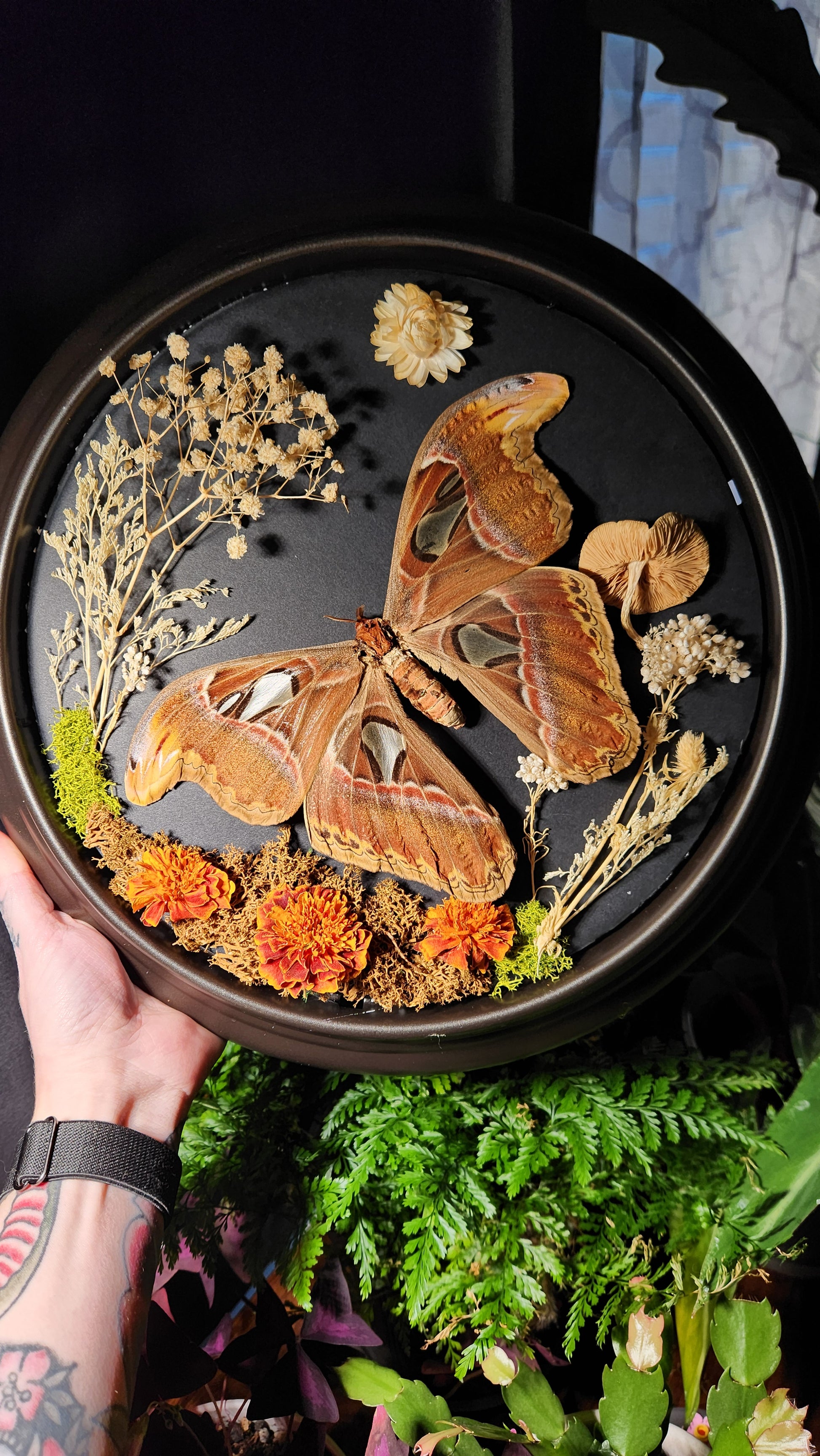 13 inch reclaimed metal clock frame with Atlas Moth spread featuring preserved moss, dried flowers, dried mushroom.