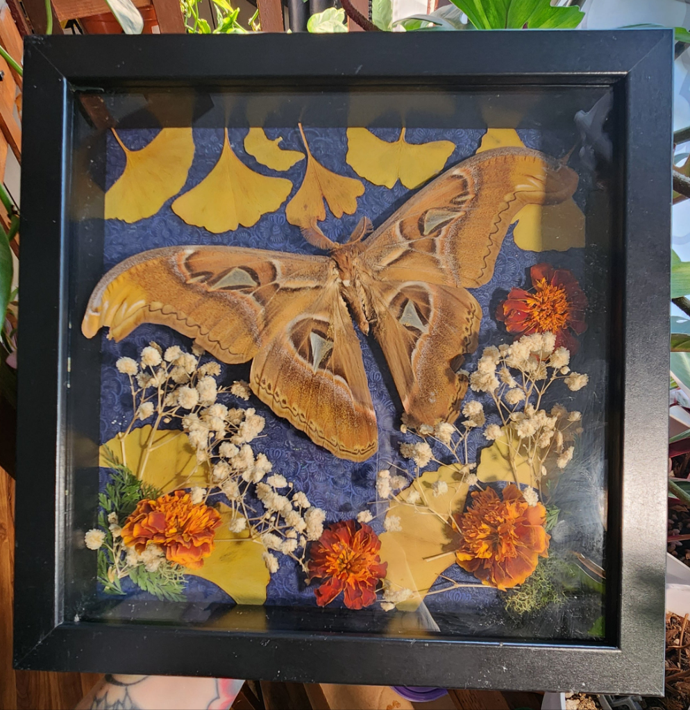 *NOTICE* this moth is damaged and not a perfect specimen. Due to this there is a HIGH risk for shipping damage. If this fails in shipping a replacement piece can be made with a DIFFERENT specimen upon return of the original product.