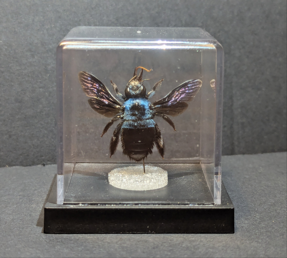 Rare Entomological specimen: Xylocopa Caerulea (Blue Carpenter Bee) spread and sealed in a 2x2 acrylic display.