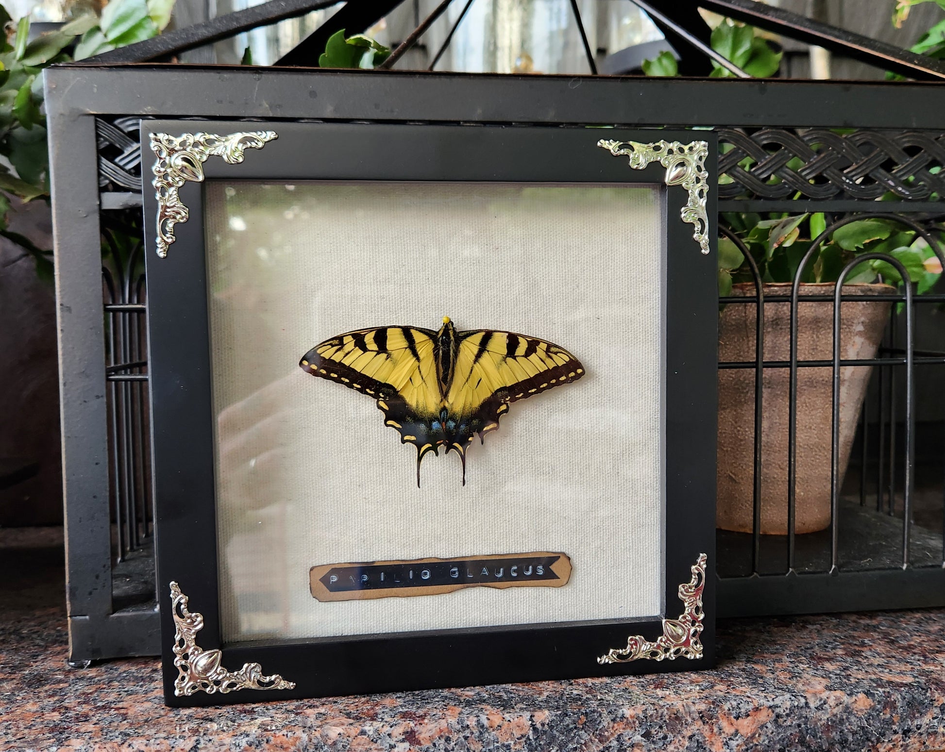 7.5 x 7.5 inch shadow box with a swallowtail butterfly. Specimen from Buford GA.