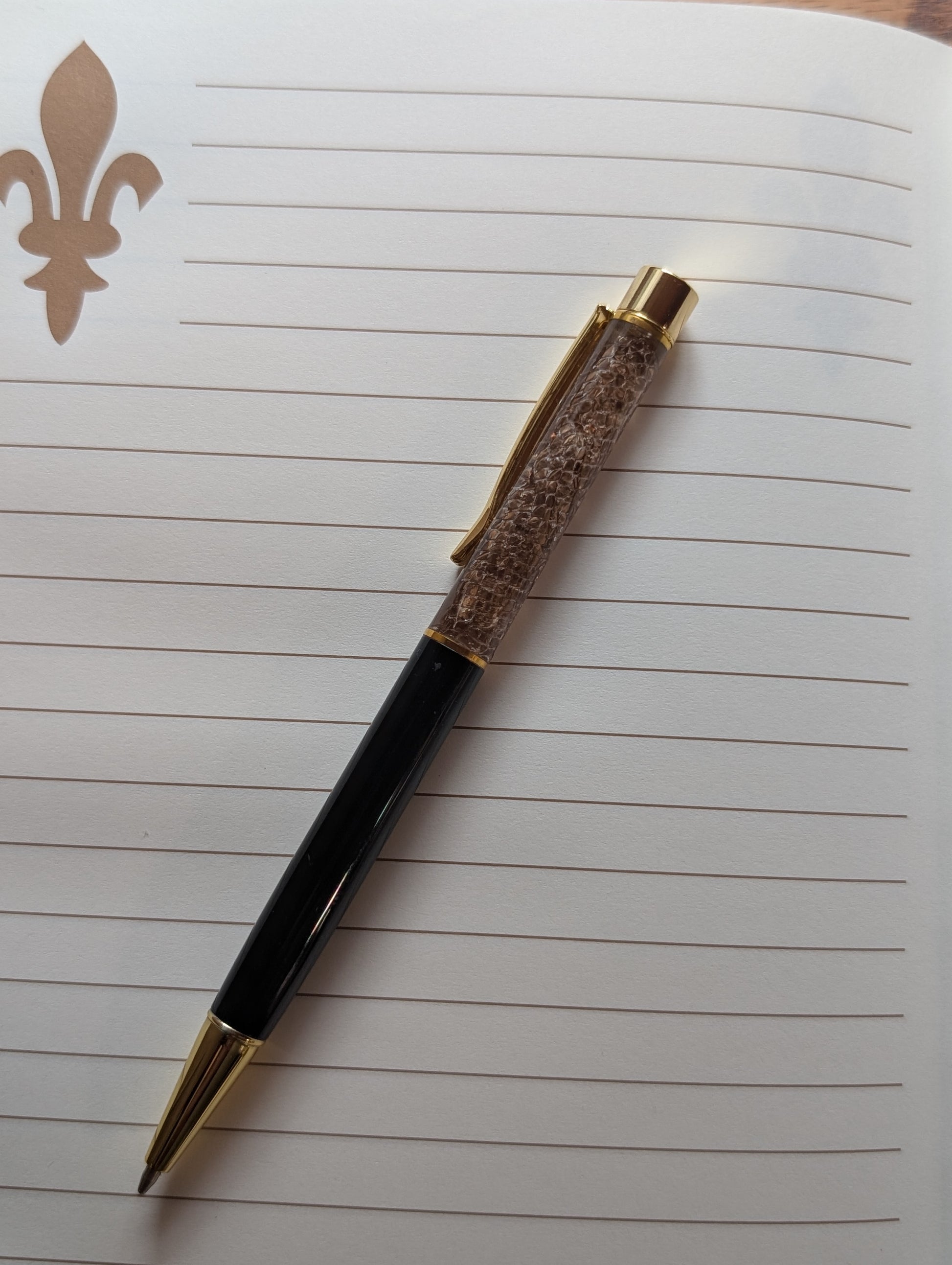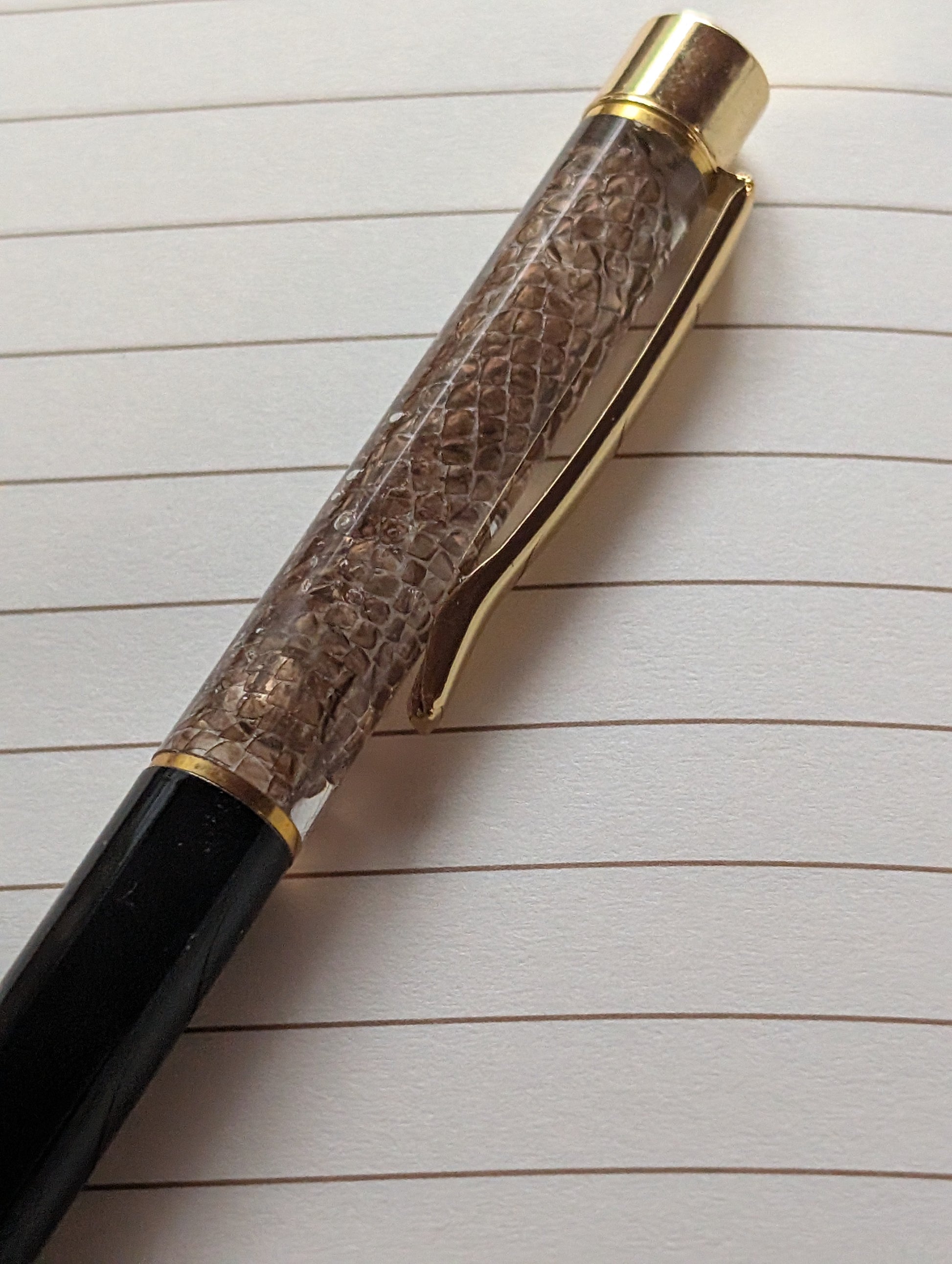 This ballpoint pen features real snake shed gifted to us by a local venomous snake handler.