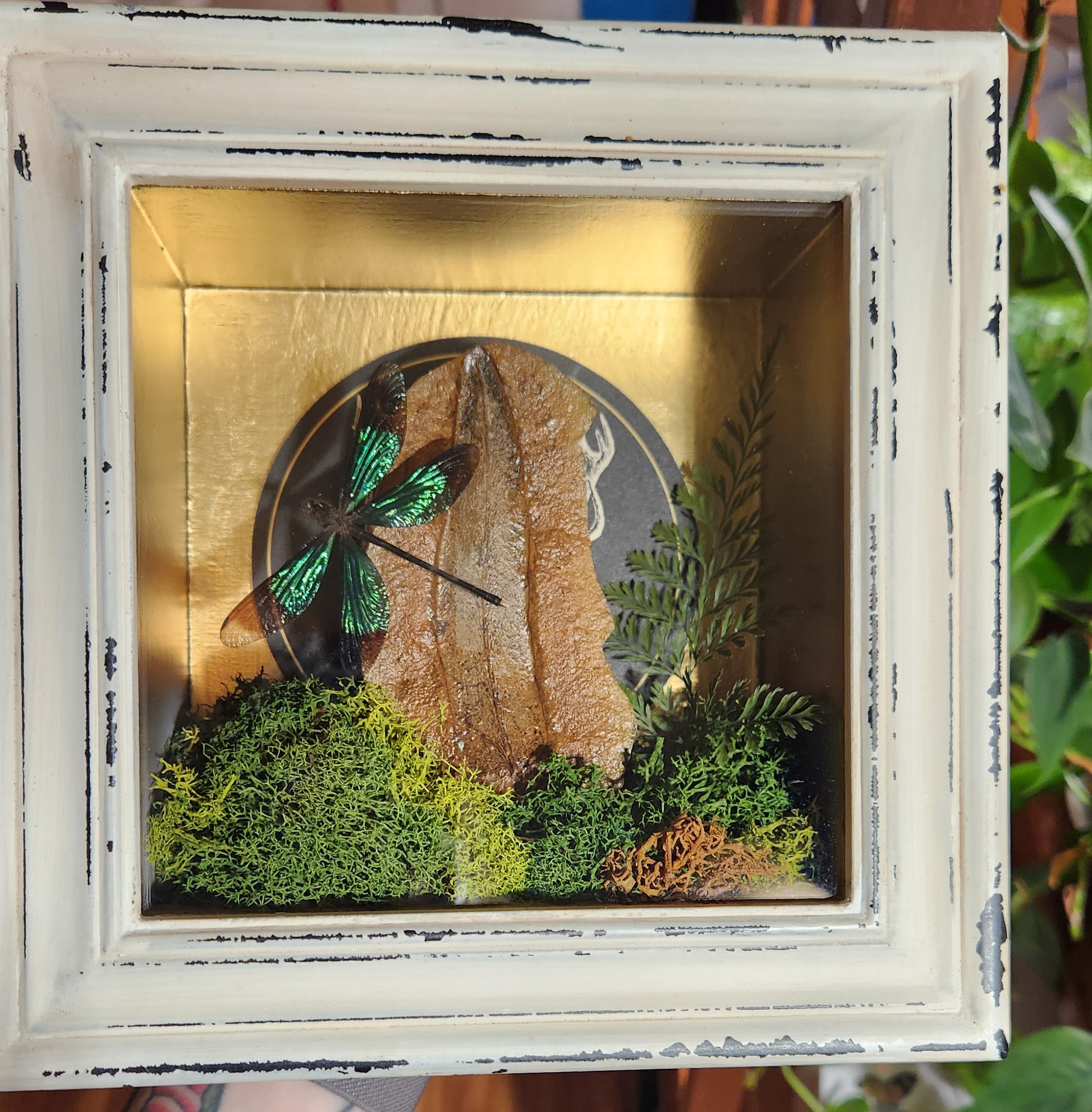 Fossilized fern with preserved moss, preserved rabbit foot fern and jewel damselfly, with gold background and antler image.