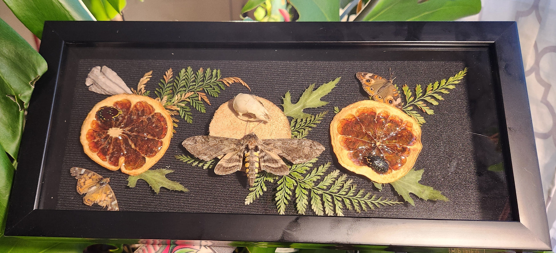 6 x 14 inch shadow box with mixed entomology specimens. Arrow head, skull, dried oranges, rabbit foot ferns. Butterflies naturally passed and found in Georgia.